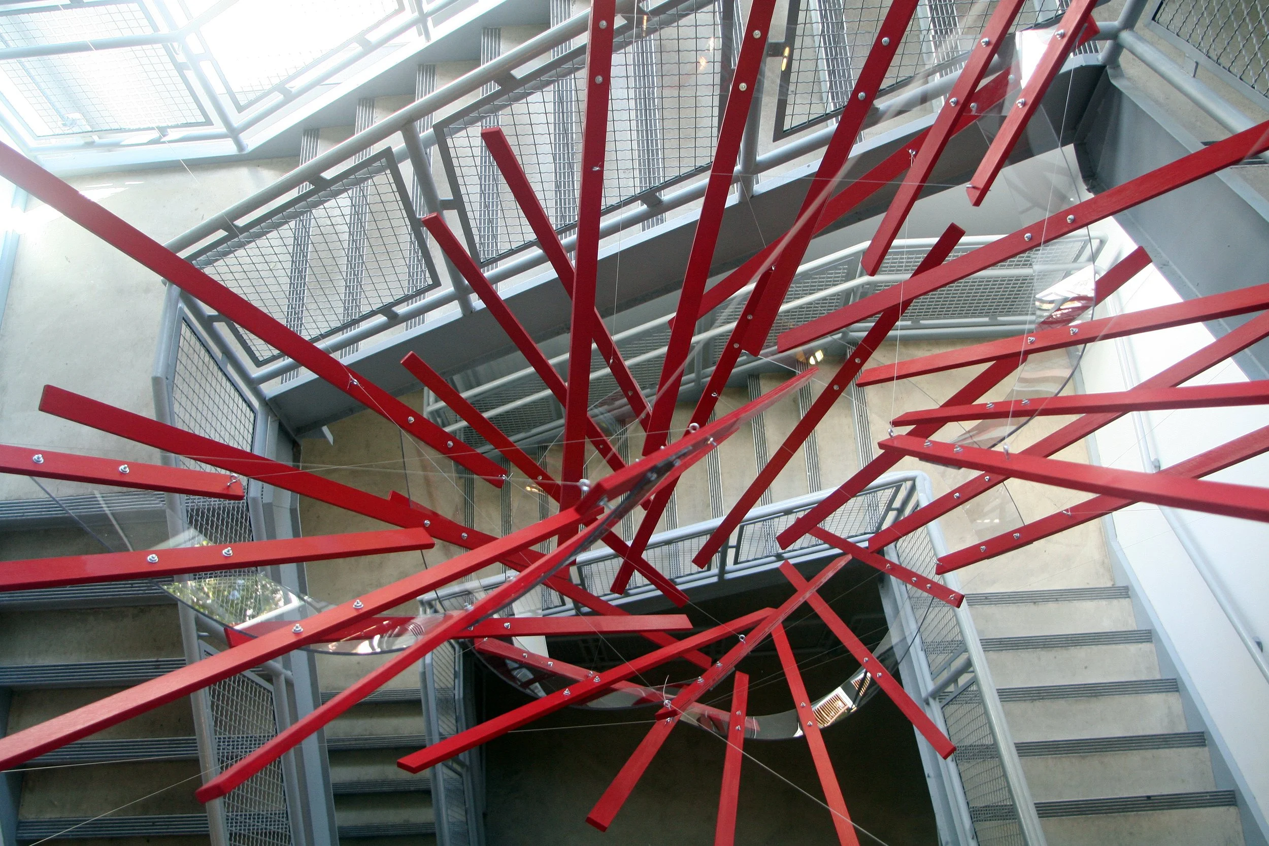 “Red Lines”, painted wood, polycarbonate, stainless steel hardware, monofilament. Installed in the Brandel Library at North Park University in Chicago, Illinois. This installation was designed to responds to the architecture of the stairwell, it is physically contained by it but seems to break free. The piece is best experienced as the viewer moves around the installation, encountering it from different angles.